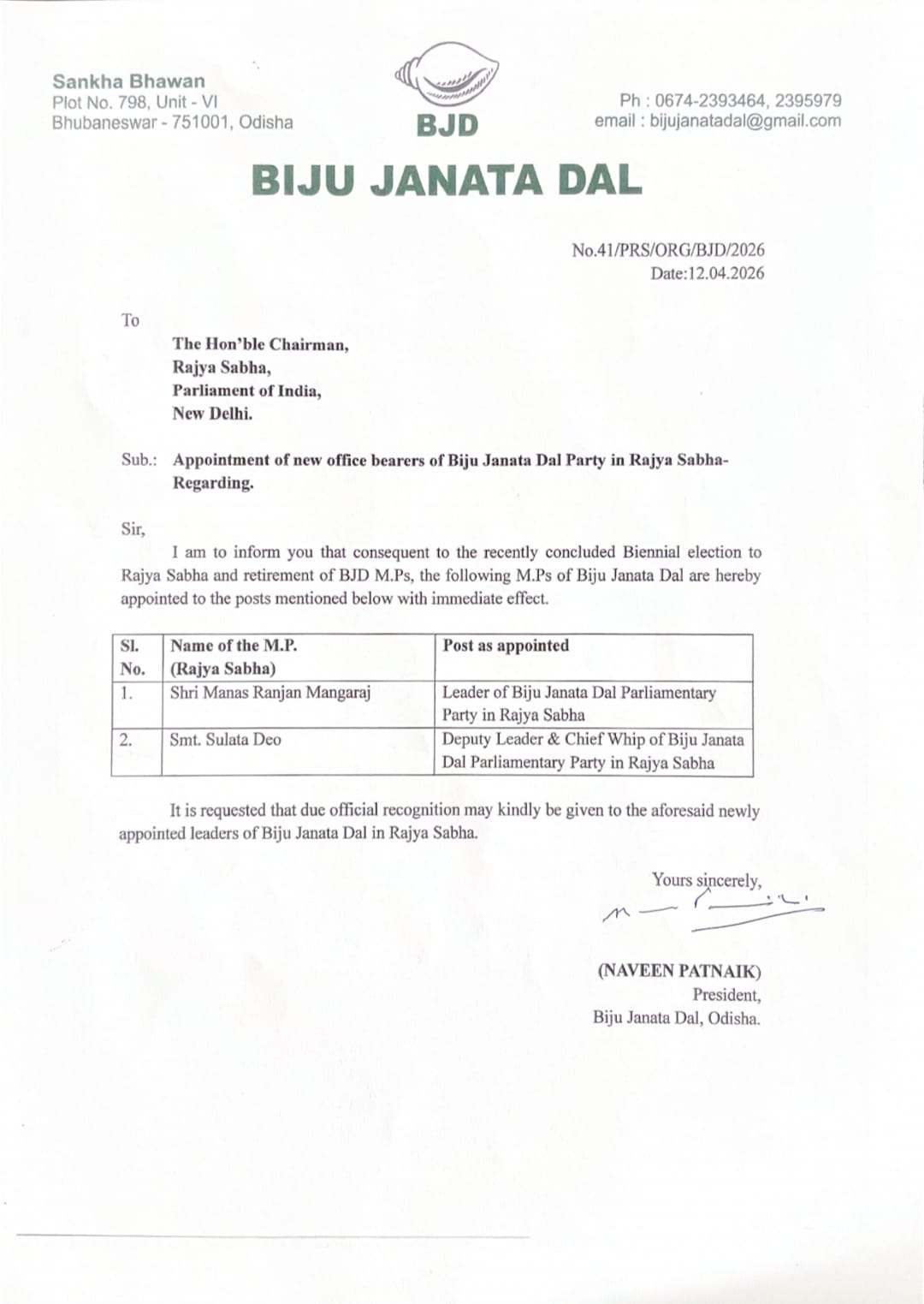 ମାନସ ରଞ୍ଜନ ମଙ୍ଗରାଜଙ୍କୁ ରାଜ୍ୟସଭାରେ ବିଜେଡି ସଂସଦୀୟ ଦଳର ନେତା ଭାବରେ ନିଯୁକ୍ତ କରାଯାଇଛି। ସେହିପରି ସୁଲତା ଦେଓଙ୍କୁ ଉଚ୍ଚ ସଦନରେ ଦଳର ଉପନେତା ଏବଂ ମୁଖ୍ୟ ସଚେତକ ଭାବରେ ନିଯୁକ୍ତ କରାଯାଇଛି।