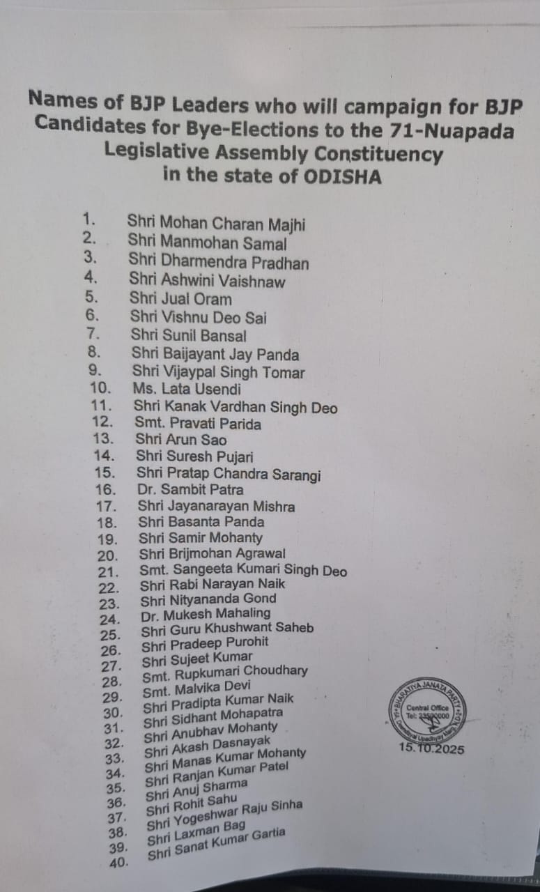 ବିଜେପି ପ୍ରଚାରକଙ୍କ ତାଲିକା : ନୂଆପଡ଼ା ଉପନିର୍ବାଚନ