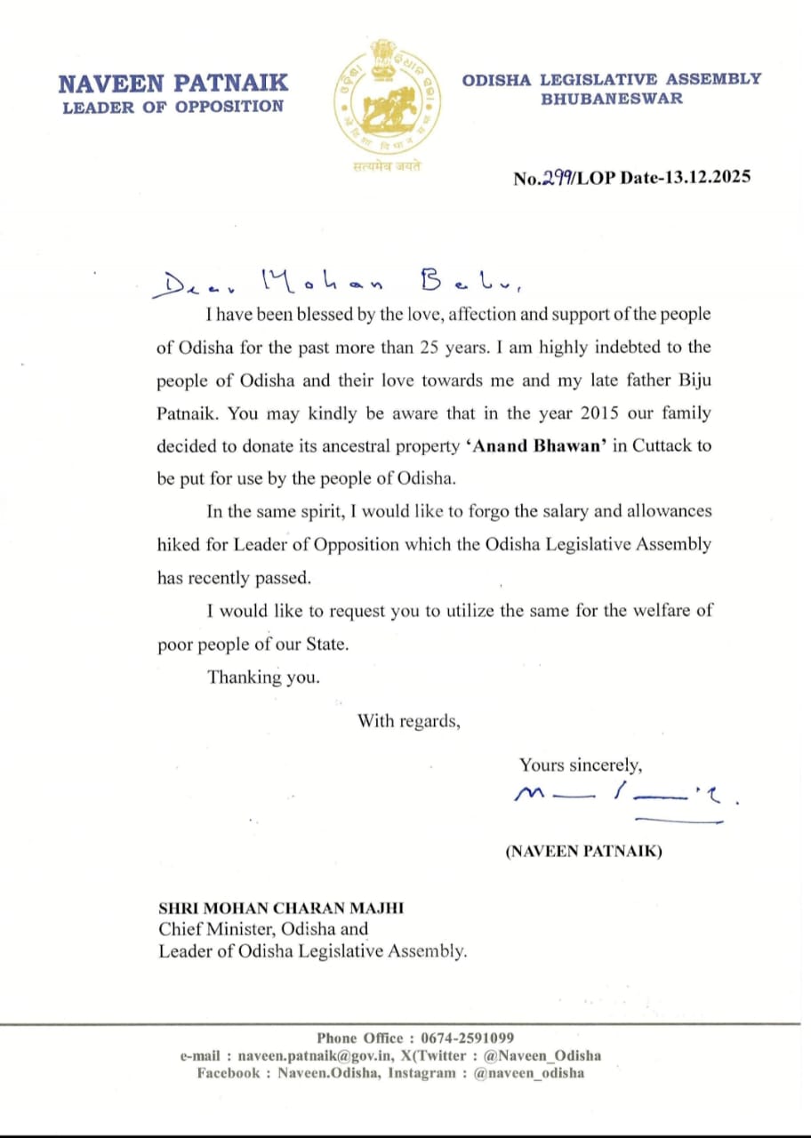 X ରେ ପୋଷ୍ଟ କରାଯାଇଥିବା ଏକ ଚିଠିରେ, ପଟ୍ଟନାୟକ ବ୍ୟାଖ୍ୟା କରିଛନ୍ତି ଯେ ତାଙ୍କର ନିଷ୍ପତ୍ତି ପରିବାର ଦ୍ୱାରା କଟକରେ ଥିବା ସେମାନଙ୍କର ପୈତୃକ ସମ୍ପତ୍ତି 'ଆନନ୍ଦ ଭବନ'କୁ ଲୋକଙ୍କ କଲ୍ୟାଣ ପାଇଁ ପୂର୍ବରୁ ଦାନ କରିବା ଦ୍ୱାରା ଅନୁପ୍ରାଣିତ। ସେ ମୁଖ୍ୟମନ୍ତ୍ରୀ ମୋହନ ଚରଣ ମାଝୀଙ୍କୁ ରାଜ୍ୟର ଅବହେଳିତ ଲୋକଙ୍କ କଲ୍ୟାଣ ପାଇଁ ପାଣ୍ଠି ବ୍ୟବହାର କରିବାକୁ ଅନୁରୋଧ କରିଛନ୍ତି।